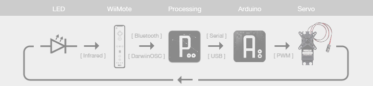 The tracking system is based on a Wii Remote (WiiMote), Processing and Arduino. The WiiMote was used for its incredibly sensitive and high quality sensors, namely the IR camera. The IR camera can track up to four individual IR sources which it relays to the host computer via bluetooth (I used DarwiiRemoteOSC for Mac OS X).